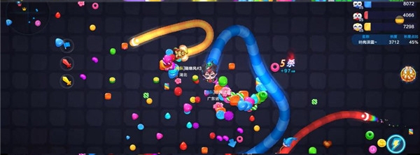 做为一只小蛇蛇,最基本的便是捡吃地面的糖果啦!尽量往糖果比较集中的地方吃,早期速度比较快,还能够尽可能与其它蛇蛇拉开距离,快速地把身体长到几百。