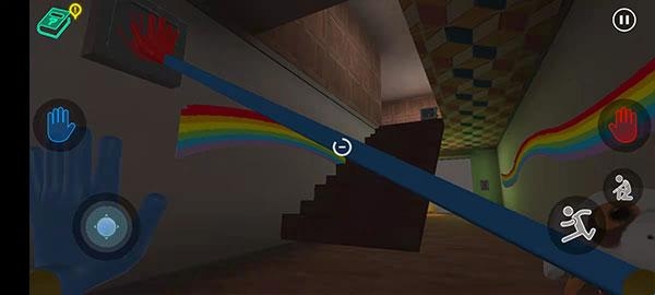 7、当手套搜集进行就会自动的带到手上,这个时候可以看到在墙壁的两侧有红色、蓝色指印,玩家只需将手套冲着相对应地区就可以将房间门开启。