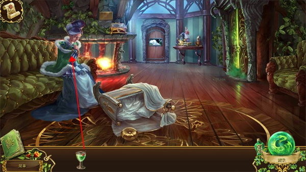 7、手里拿着理智剂返回大客厅,皇后的后妈躺在沙发上,我们点击皇后的卧室,会有一段故事情节,以后门被锁住,皇后的后母显而易见受到惊吓,我们可以把理智剂给他。