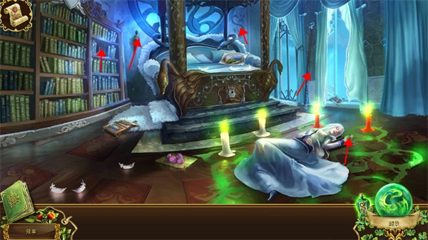 10、在皇后的房间里,床左侧墙壁取得一根熄灭的火把,右侧阳台得到一根勾子,从皇后的手里获得一个墨绿色的徽章。