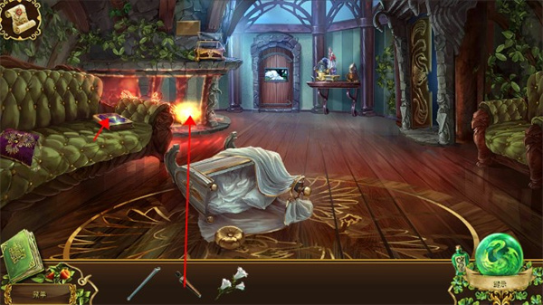 13、开启暗道后发现里面漆黑一片,必须火堆才能进去,最后我们赶到大客厅,将熄灭的火把到火炉的火中引燃,再移走沙发上的枕芯,有这书,打开会获得一块碎片。