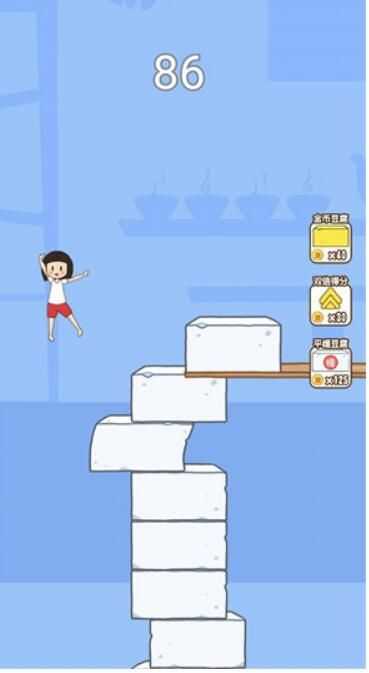 在跳跃的过程中需要进行准确方向分辨,确保小女孩能完美的跳跃到豆腐块上,根据滑动屏幕就能操纵小女孩跳跃下去,向芳堆积豆腐块次数越多,上方小姑娘也就越不稳,非常容易越来越歪歪斜斜,一不小心就会坍塌出来。每一个不一样关卡的考验当然难度系数也是不一样的,在关卡中可以用你以前得到的道具,有利于玩家迅速过关获得高分。