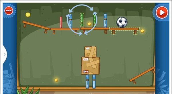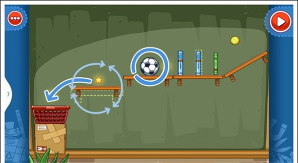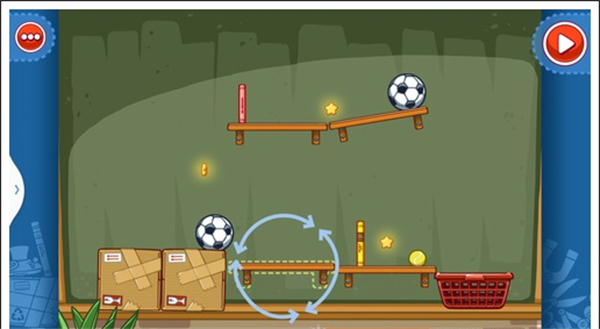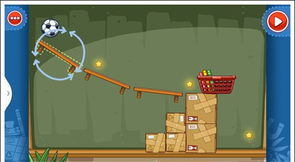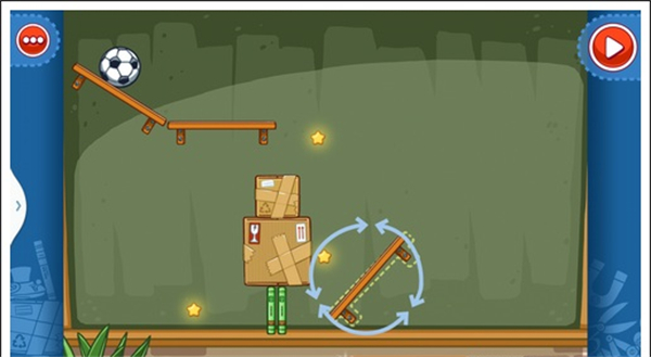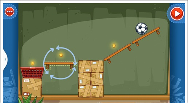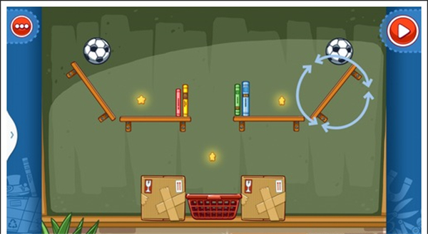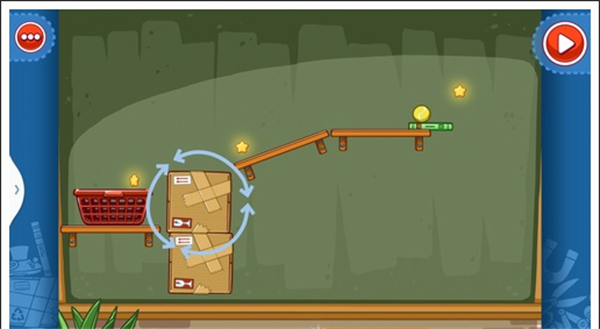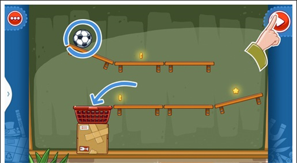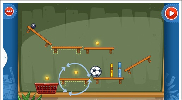 1-9关卡我们只需要把两个板凳放到图中所示的位置,让球滚下来就可以得到星星了。