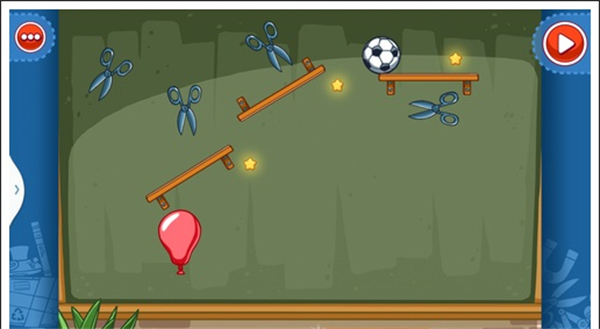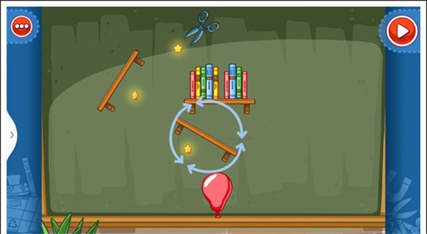 1-14关卡我们只需要在剪刀下面放置三个木凳,否则气球会撞到剪刀而破裂,这样气球就可以飞起来并获得星星。
