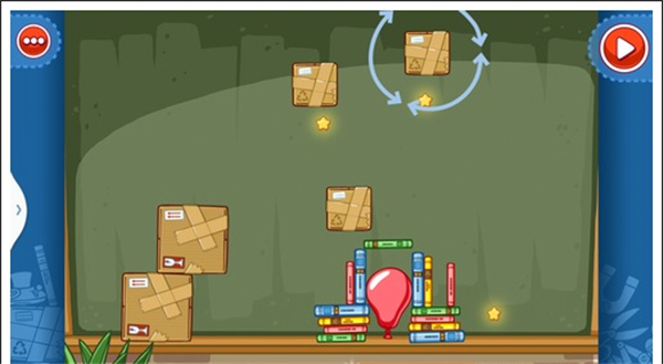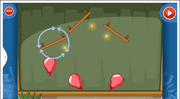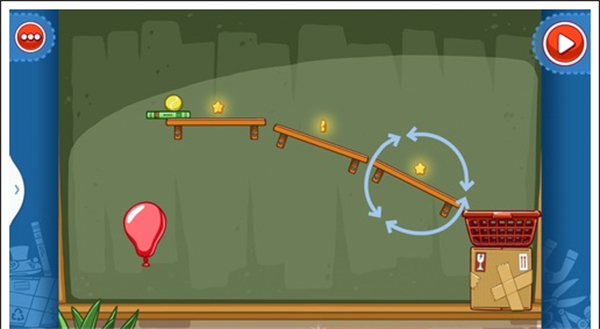 1-12关卡我们只需要在星星上方斜放两个木凳,就可以让气球自由飞翔,获得星星。