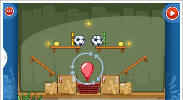 1-15关卡我们只需要在两边对角放置两个木凳,把气球放在足球下面,这样气球就会飞起来,撞到足球就可以得到星星了。