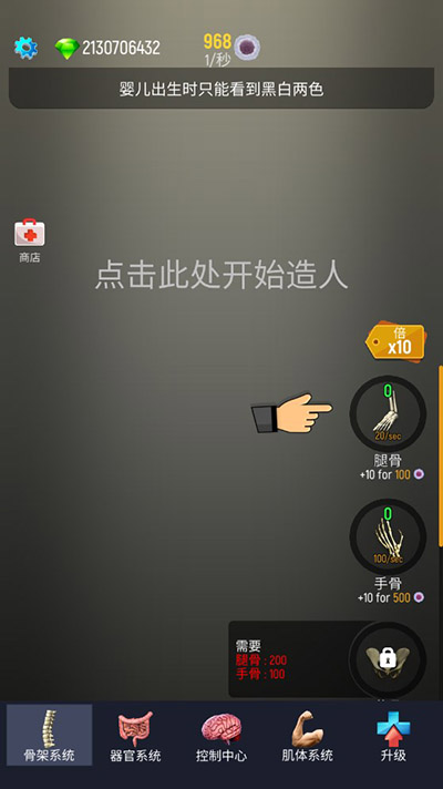 该游戏是一款简单的放置游戏,利用细胞来构造人体的各个部分。