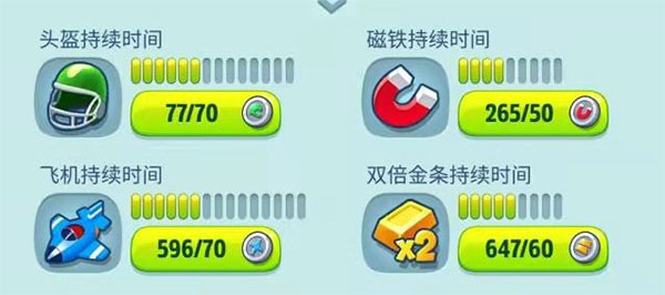 如何在短时间内收集更多的金条?很简单,用“磁铁”!这个道具可以“吸”界面中所有的金条。因此,只要当前路线上没有大的障碍物,玩家就可以在不变道的情况下收集大量金条。然而,磁铁就像头盔一样,只能工作有限的时间。玩家可以通过升级角色的“磁铁持续时间”属性来获得更持久的“吸金”效果。