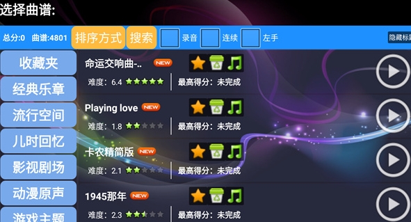 1.音乐库:在这里您可以尝试最新更新的曲目,挑战极限(赢得冠军)。获得的分数将计入数据总分中。