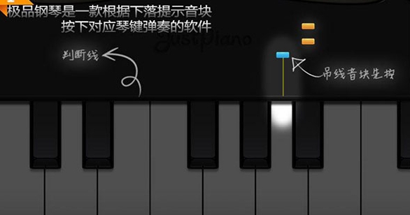 1.终极钢琴是一款根据下落的音块按下相应的键来弹奏的游戏。键上方的黑线是判断线。游戏过程中,需要先按下悬挂的音块。也就是说,声音块会先到达判断线。当音块密集时,方便玩家判断。按下这个声音块后,会产生第二个挂线声音块,这也是游戏的一个小提醒。