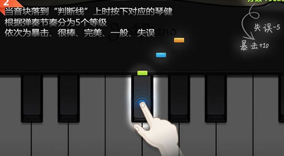 2.当声音块落在“判断线”上时,只需按相应的键即可。根据玩家的演奏节奏,可分为5个级别,即暴击、出色、完美、一般、失误。失误扣5分,重击扣10分。