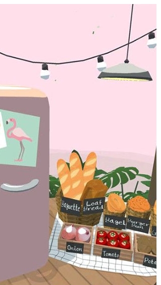 当你转动手机时,游戏中的视野也会跟随,你可以轻松找到冰箱、食材、菜板等物品。之所以是无忧厨房,是因为你不需要自己去购买冰箱里的食物。玩完后,冰箱里的食物会自动补充。