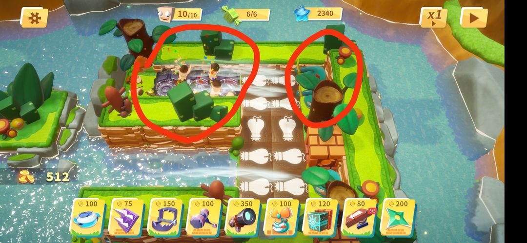 如图所示,这张地图非常适合地鼠锤。四把锤子加上一个捕熊器,操控绝对是满的。这里必须提醒的是,最好调整两把锤子面对面的自动攻击模式,错开两把锤子落地的时间,千万不要让它们同时攻击。