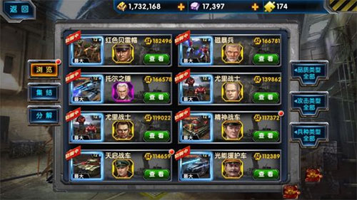 2、部队可以培养为主力和增援部队。你重点培养的部队一定要选择来源稳定的部队。前期主力可以选择犀牛坦克、坦克杀手、小红帽、火箭装甲车、长弓阿帕奇飞机。除坦克杀手和小红帽外,其余达到8星后将暂停继续晋级。当玩家已经拥有一定的资源时,主力部队会逐渐转变为猛犸坦克和特斯拉。重点培育坦克、磁力坦克、坦克杀手、夜鹰直升机。主力改造时,注意不要急于求成,将改造所取代的前主力分解为万能碎片。替换下来的主力全部投入增援,使部队总数达到15人。这样一来,无论是竞技场还是防御矩阵,都不会捉襟见肘。