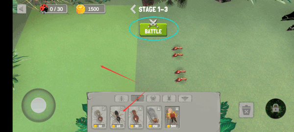 3.进入战斗,选择在底部召唤一只小虫子,将其放置在左侧空地上。完成后,点击上方的战斗。