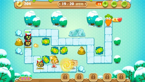 3、关卡关卡会有几个主题:雪地、丛林、冰川、天际线、冰岛等。总共135个关卡,模式应该和保卫胡萝卜一样。