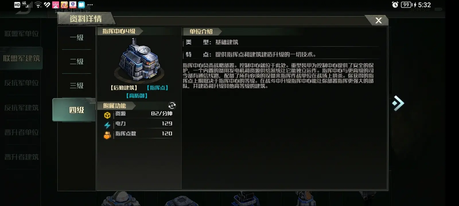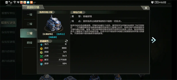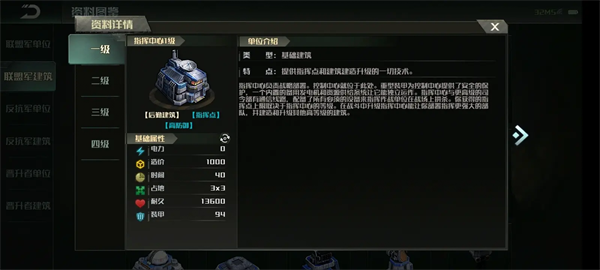 联盟军和上升1到3的指挥中心拥有完全相同的生命值和装甲数据:1有13600生命值,94装甲,2有19100生命值,99装甲,3有27560生命值,104装甲。