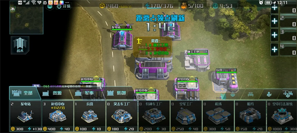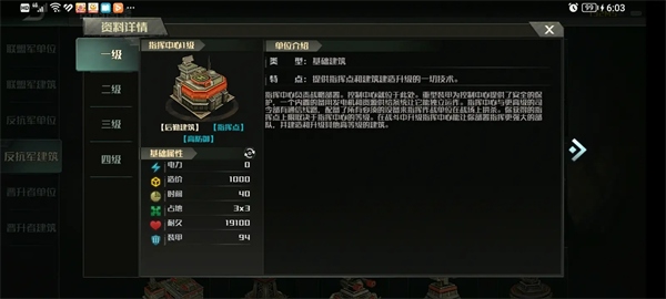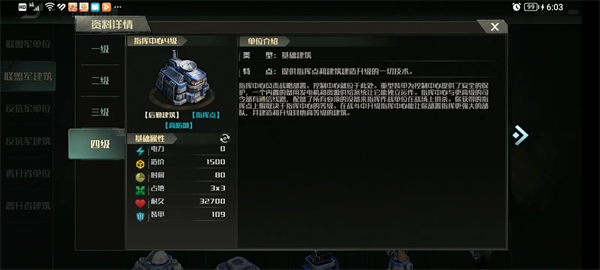 解锁建筑:建筑工地限制3、突击车工厂限制3、特种车辆工厂限制3、空军工厂限制3、机场限制2、码头限制3、基本防御塔限制4、炮塔限制3、防空塔限制6、海防塔限制4