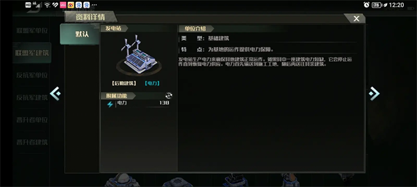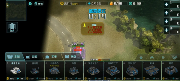 解锁建筑:建筑工地限制1个、发电站、补给中心、兵营限制3个、突击车工厂限制1个、造船厂限制1个、基础防御塔限制2个、海防塔限制1个