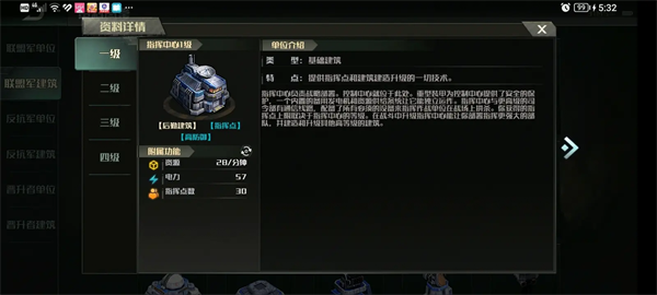 1级:提供:28资源/分钟,提供57度电力,提供30个指挥点。