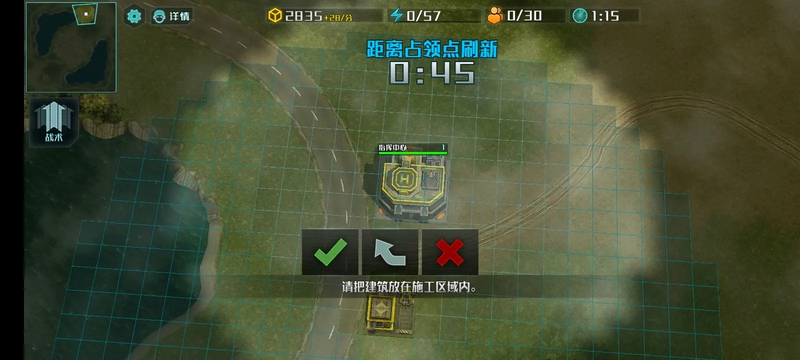 第一个建设场地只能建设在指挥中心一定范围内,如图: