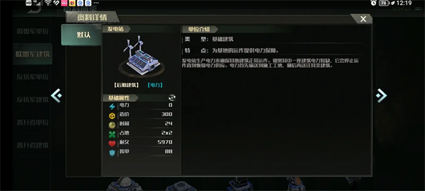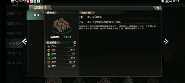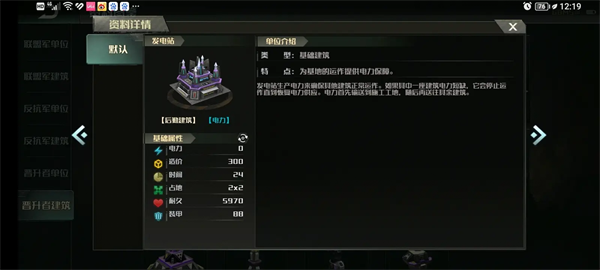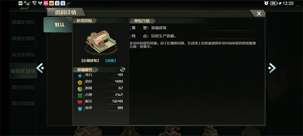 所有建筑均为Ill级装甲(即游戏中的重甲)。为了方便起见,游戏中的补给点统一用(金钱/资源)表示,电力用(度)表示,耐久度用(生命/血液)表示。