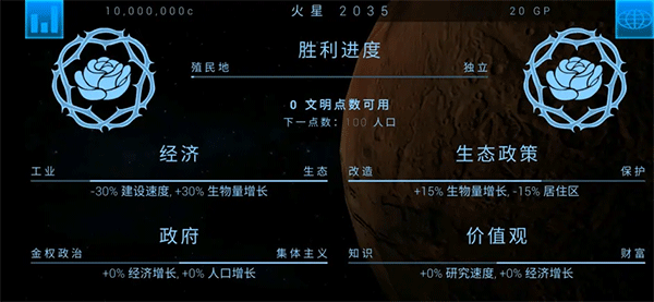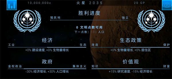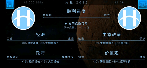 - 改造你的星球,改变每个世界的特定属性以支持人类生命,包括气压、氧气、海平面和生物量