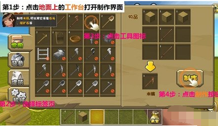 点击打开地面上放置好的工作台,即可打开制作工具当你身上有材料时,工作台的制作界面会自动显示所有需要用该材料制作的道具。如果其他材料不足,会有红色标记提示。是不是很方便呢?