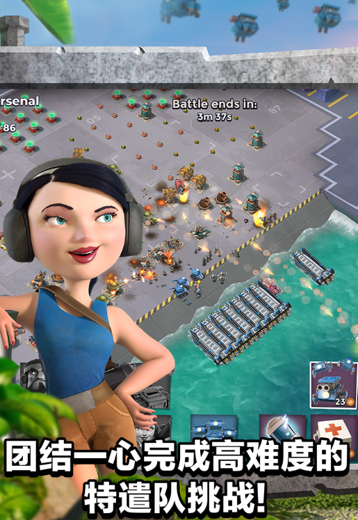 游戏玩法:玩家率领部队漂洋过海,前往数百个美丽的岛屿,夺取岛上的每一个滩头阵地和基地,解放被奴役的岛民,探索未知的群岛……驰骋大海!此外,战舰系统也是《海岛奇兵》的独特亮点。引导炸弹引导行动、烟雾弹隐藏部队、冲击弹冻结建筑物、多管火箭发射器进行大规模杀伤……战舰将为玩家提供多种武器支持,通过不同兵种的组合达到令人惊讶的战略效果。