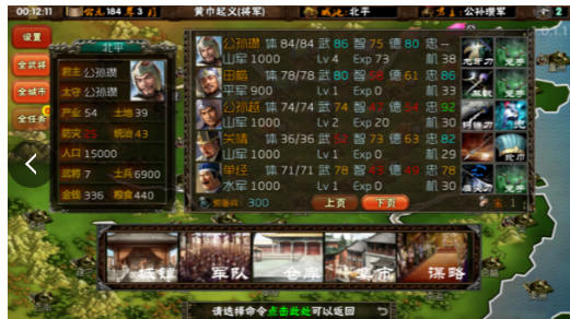 开始后:进入游戏画面,点击城市,使用搜索功能(注意最好使用第一名的武将)。基本上,你可以搜索一两次新武将。一个城市基本只有一个,但是过一段时间(笔者不知道多久)就会刷新。还有一个叠加的效果,就是搜索时间长的话,可以不断的搜索武将,征粮,补充兵力。注意利用奖励功能来增加忠诚度,否则可能会出现自立、叛逆等情况。
