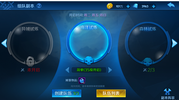 团队副本中有6种试炼,对应6个阵营,会掉落相应阵营的材料,可以用来炼制圣器。每天开放2次试炼,1次试炼可挑战3次。失败不算数,只有胜利才算数。