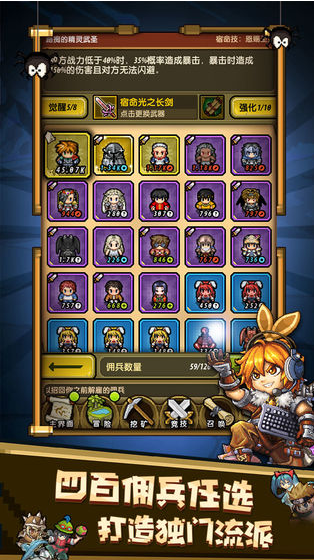 3.游戏中你可以不断冒险,招募雇佣兵来提升自己的实力,也可以挖矿、击杀怪物来获取各种资源。