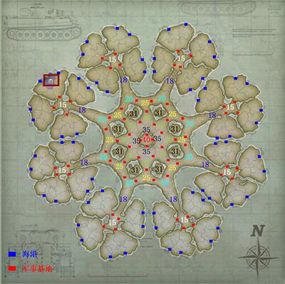 每个岛屿只有两个海港,四个岛屿之间的连接处有一个军事基地。 15级城市将成为各岛屿成员的优先攻击点。不过,你也可以尝试使用运输船攻击18座城市的扼杀策略。