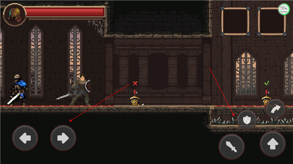 1.游戏左侧控制方向,右侧分为攻击、防御、跳跃、翻滚;