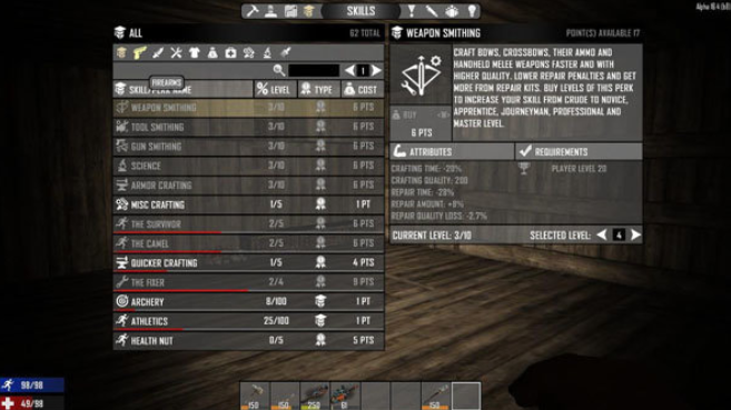 每个技能都达到了3级,也就是说制造品质是150。这个时候普通丧尸只是送经验,可以用远程木弓对付。