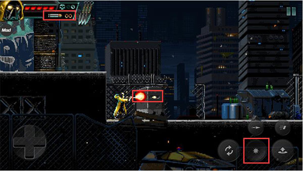 9.技能下方是【攻击】按钮。单击它可以发射子弹。一些特殊枪械有子弹限制,子弹数量显示在角色生命条下方。