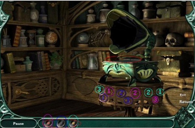 拿起物体,然后靠近留声机。要组装留声机,你需要9 个小圆盘(放回原来的位置时会有不同的图案)、一个喇叭、一个喇叭支架和一个用于放置唱片的划线器(我不知道技术名称是什么)。这些材料在每个房间和书架上的锁箱里都可以找到,所以你需要找到钥匙才能打开它们。光盘很难找到。多点鼠标。安装好机器后,播放找到的三张唱片(一张唱片三种音效)。根据听到的声音,按照9个圆盘上的相应图案(鸟、猫、牛、马、蛙、雨、雷、火、山、水),打开左下柜子,得到实验室钥匙,进入实验室