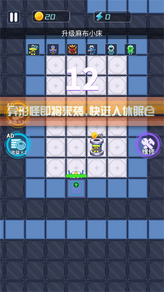 2.升级你的炮塔,强化大门,抵御入侵者的入侵。玩法比较自由,多种不同的房间可以选择;