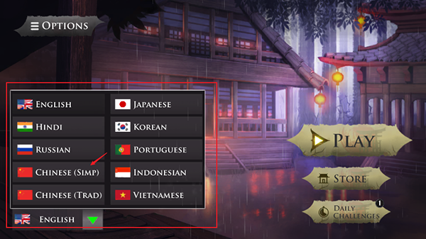 1.首先在手机上打开游戏,点击这里选择语言中文;