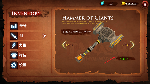 4.这里是剑、力量、裙子饰品的详细介绍。点击EQUIP可以更换新的武器和裙子;