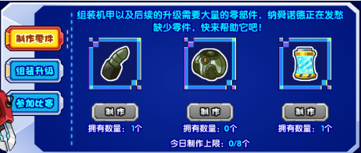 制作零件分为三个部件,从左往右分别是:骨关节、人体、电力能源,单独制作时长各自必须:骨关节45秒、人体30秒、电力能源1min,每天都有八次制作机遇,制作结束下边会有表明总数;