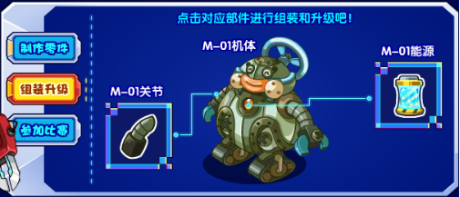 取得充足的部件后,还可以在点一下部件进行组装/更新,接下来会参加比赛时,会有型号等级要求,大伙儿关键点一下部件根据需求的总数进行提升就可以。
