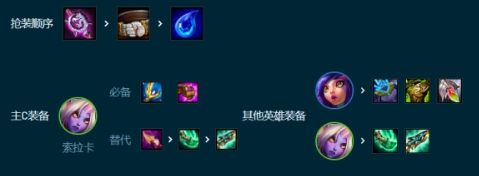 主C索拉卡:永恒之戒+珠光护手+纳什之牙/鬼索/青龙刀。主坦卡萨丁/妮蔻:离子火花+狂徒+赎罪。这一套阵容的爆炸输出虽然不高,可是枸椽酸是十分可观的,总是能拖进加时,因此我们优先选择做黑暗君主给索拉卡,伴随时间的累计,黑暗君主所产生的法强会更高,索拉卡专业技能从而能做到击杀敌军棋子的实际效果。