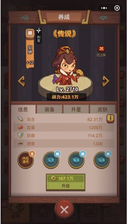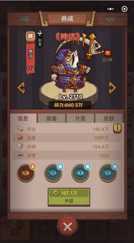贾诩:神话传说质量的咸将,归属于群英势力,场中位置为杀手,不仅也会降低对手特性,还会继续提高自身攻击和生命,使对方觉得很棘手。