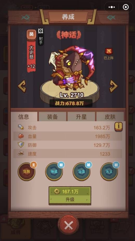 太史慈:太史慈是神话传说质量的咸将,射手座部位,拥有超高的伤害输出,作战全过程里可使自身攻击,暴击伤害和生命都能得到大幅度提高。