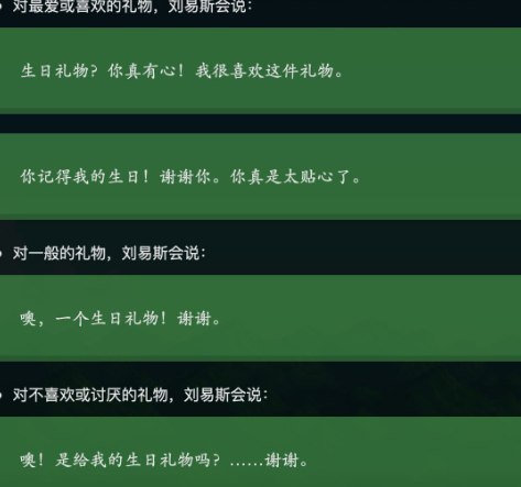 1、刘易斯的第一个生日我们可以送他喜欢的东西,我们在他的生日(春季 7)送出的礼物会有8倍的效果,并展示以下独特对话。