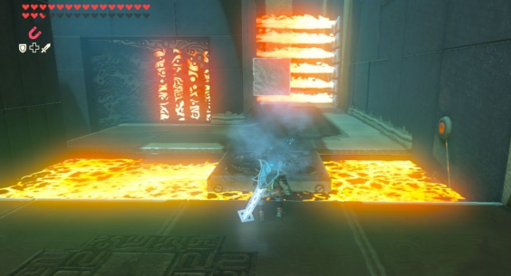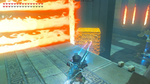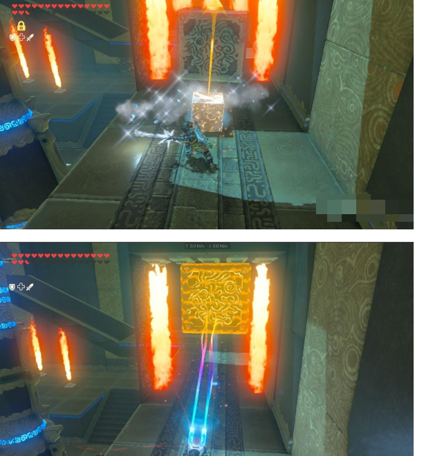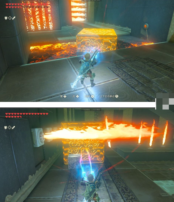 8、后面从上往下喷的火焰,需要先静止住冰块再往前蓄力打击三四下,然后立即磁力抬起铁块挡住火焰 ,这样冰块就可以飞过去