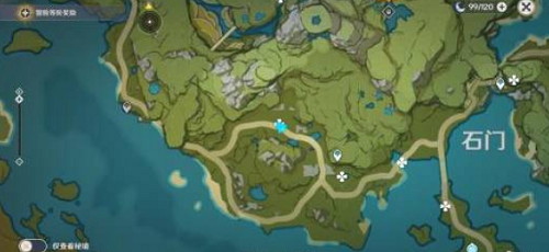 3、岩神像的碎片位置在轻策庄的西边,玩家去西边找一个黄色的大晶石就可以找到岩神像了,具体位置如下图: