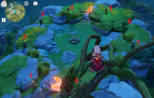4、最后一个碎片在无妄坡的最高山峰处,达到最高处会看到八个石像,其中只有四个是正确的,正确的石像顺序是下图中7-1-4-2: