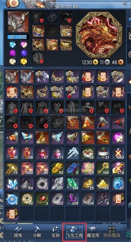 剑灵飞龙工商可以按【I】剑打开包裹,在最底下的第4个就是飞龙工商。